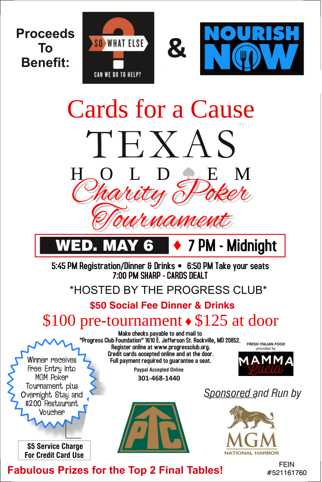 Join us for Cards for a Cause, an exciting charity poker tournament where every hand played helps support So What Else and Nourish Now in their mission to fight food insecurity and serve local communities. Hosted by the Progress Club & MGM National Harbor!