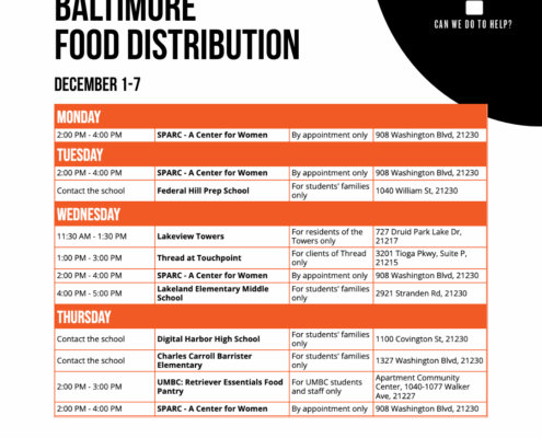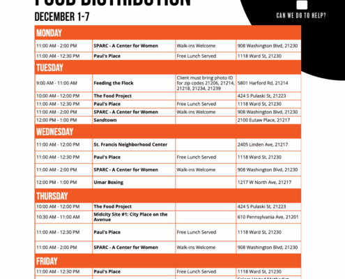 We need your help! The more volunteers we have, the more people we can serve right here in Charm City. Some specific volunteer opportunities are listed on our Volunteer Hub page, but if you have an idea for how you would like to contribute that isn’t listed, please email us details.