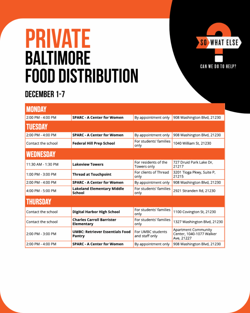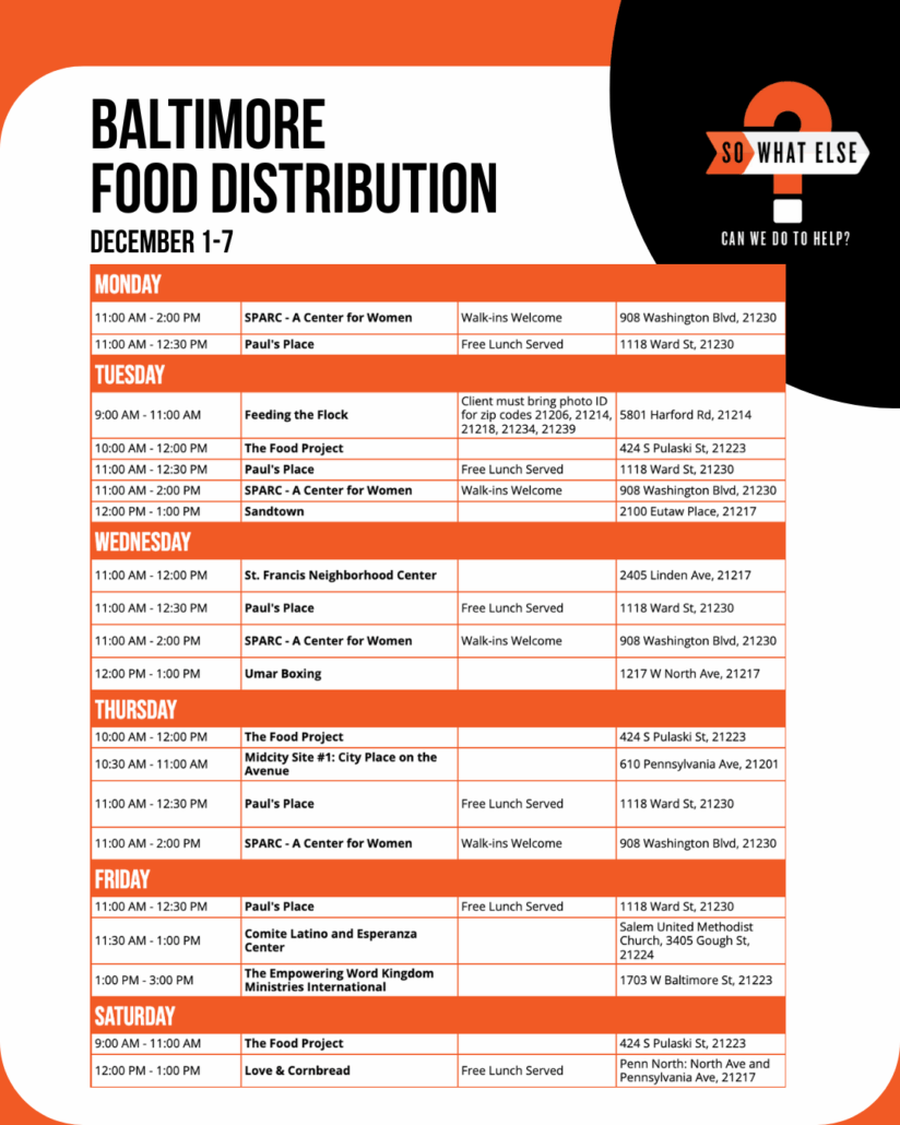 - Baltimore Food Support: Justin Weeber (410) 429-0657