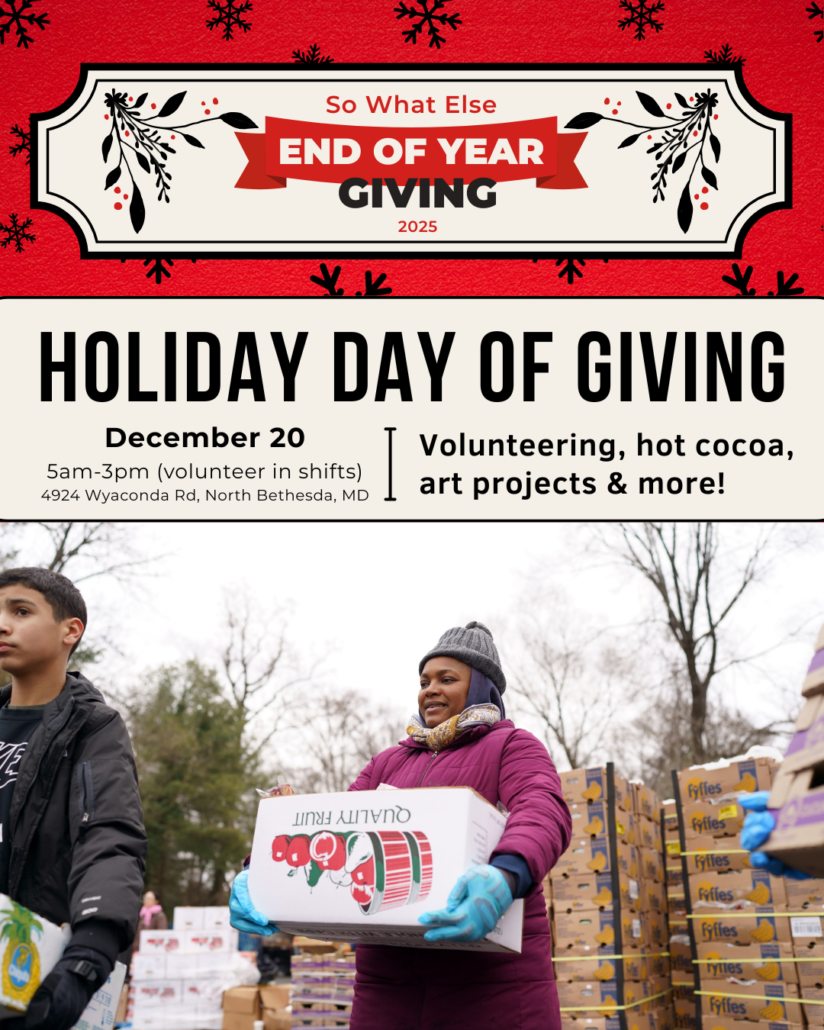 Bethesda, Maryland — December 20, 2025 — This holiday season, So What Else invites community members, families, and volunteers of all ages to join us for Spread the Joy: Holiday Day of Giving, a full day dedicated to uplifting families in need and celebrating the spirit of giving.