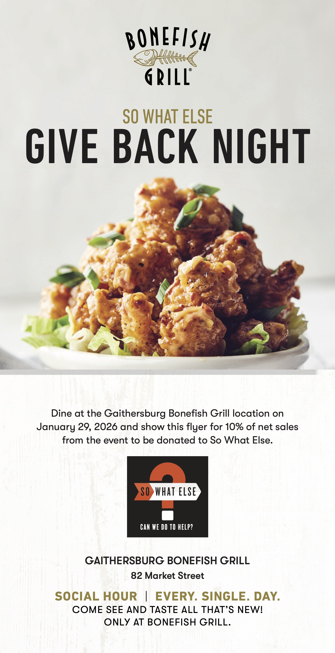 Dine at the Gaithersburg Bonefish Grill location on January 29, 2026 and show this flyer for 10% of net sales from the event to be donated to So What Else!