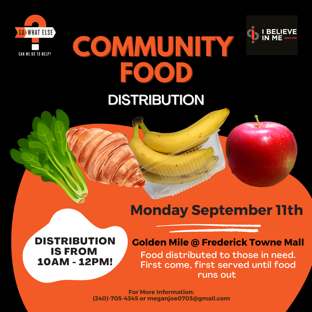 Stop by our pop-up food distribution in Frederick, Maryland, with our partner, I Believe in Me. Food is served on a first-come, first-serve basis and will include items such as produce, non-perishable goods, and more. For more info, call 240-705-4345 or email meganjoe0703@gmail.com.